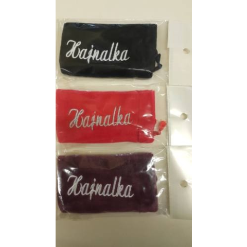 12 cm magas és 8 cm széles, névre szóló tartó, felül madzaggal összehúzható. Anyaga: plüss