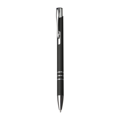 Vékony gumírozott fém golyóstoll, kék tollbetéttel, ezüst gyűrűkkel, nyíl formájú klipsszel