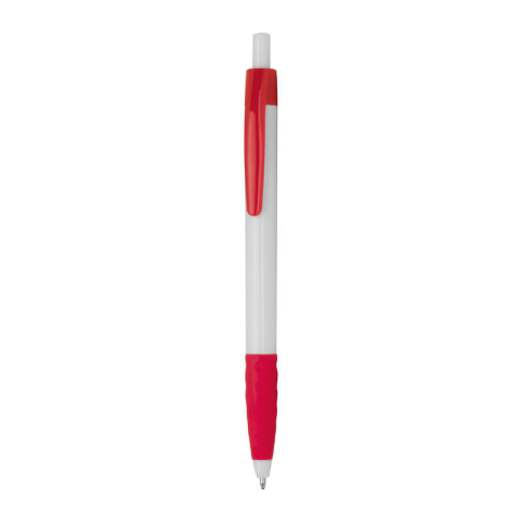 Műanyag golyóstoll, feketén író tollbetéttel. Színes klipsszel és fogórésszel, fehér tolltesttel