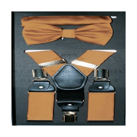 Newsmen ajá,ndé,k szettTartalma: Nadrá,gtartó,, csokornyakkendő, dí,szzsebkendő.Alapanyag: Bőr, polié,szter, fé,mMindhá,rom termé,k azonos szí,nben ké,szü,lt, nadrá,gtartó, Y fazonú, fé,m kapoccsal rö,gzí,thető.A csokornyakkendő é,s a nadrá,gtartó, is mé,retre á,llí,tható, kivitelű.