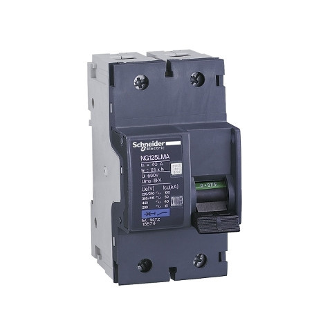 Kismegszakító 2MA 25A 50kA NG125L 18873 Schneider \nNG125L kismegszakító, 2p, MA, 25A. termékcsalád: NG125, Acti 9 - termék vagy komponens típusa: kismegszakító - készülék rövid megnevezése: NG125LMA - készülékalkalmazás: motor - kioldóegység technológi