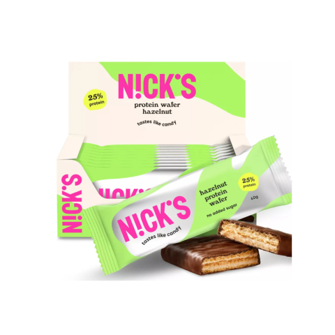 Nick's Proteines Mogyorós Ostyaszelet 40g 🥜🍫 – Ropogós, fehérjés élvezet cukor hozzáadása nélkül! 💪. Ha szereted a mogyorós finomságokat, de a tudatosabb nassolás is fontos, ez a szelet neked készült! A Nick’s mogyorós ostyaszelet kívül-belül csokis, közben pedig proteinnel és rosttal dúsított – ráadásul hozzáadott cukor nélkül készül. 😍👌. ✅ Gluténmentes✅ Fehérjében gazdag✅ Édes íz kompromisszumok nélkül. Tökéletes edzés utánra,