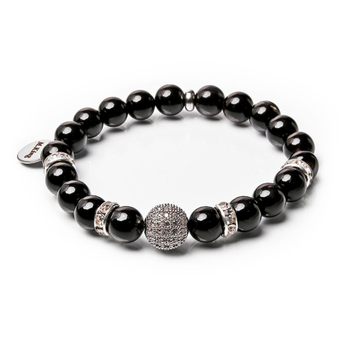 RUGALMAS KARKÖTŐ, a mérete választható.Az ékszer ásványai és tartozékai:– 8 mm-es fekete achát – 10 mm-es strasszos pavé dísz– 8 mm-es ezüst színű strasszos díszek– M.King márkajelzésű nemesacél logóbiléta.– Technika:
