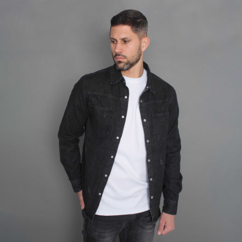 Slim Fit, fekete színű farmer ing, patentos, gallérral és patentos kézelővel, lekerekített alsó szegéllyel, enyhén szaggatott részletekkel Modell: 185 cm/ 85 kg / L-es méret