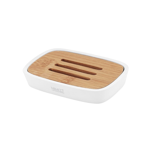 Szappantartó. Fehér szín. Anyaga polirezin, bambusz fa.
