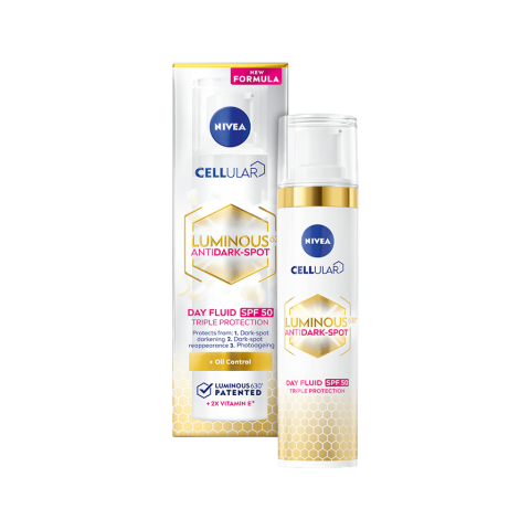 Gyorsan beszívódó nappali arckrém öregségi- és pigmentfoltok ellen, LUMINOUS630-nal és SFP 50 fényvédővel: NIVEA Cellular Luminous630® Pigmentfoltok Elleni Nappali Krém SPF 50 40ml.