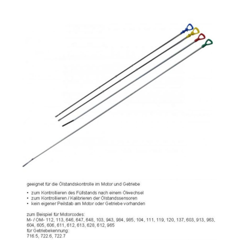 A Mercedes motor olaj és automataváltó-folyadékszintjének ellenőrzéséhez. A készlet tartalma: Sárga nívópálca (930mm hosszú): motor olajszint ellenőrzéshez: 103.943 , 103.984 , 103.985, 104, 111, 119, 120, 137, 603.913, 603.963, 603.97, 604, 605, 606, 611