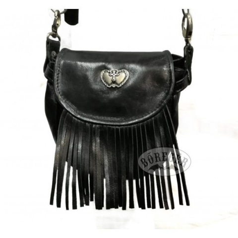 Fekete, valódi marhabőrből készült női táska, rojtokkal díszítve. A közepén duplaszív díszítés. Mágneses zárral. Mérete kb: 17 x 16 x 10 cm