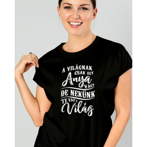 Női póló anyának, ajándék édesanyáknak, a világnak csak egy anya vagy, de nekünk Te vagy a világ felirattal. Népszerű ajándék anyák napjára, de bármilyen olyan alkalomra amikor anyukádat szeretnéd meglepni valami különleges ajándékkal. Most akciós áron 1