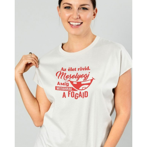 Humoros női póló fogorvosnak, élet rövid, mosolyogj. Egy vicces női póló ami bármilyen alkalomra megállja a helyét. Tökéletes ajándék, de vicces meglepetés a mindennapokra is. Többféle színű női póló választható minta színnel. Anyaga pamut. Kiváló minő