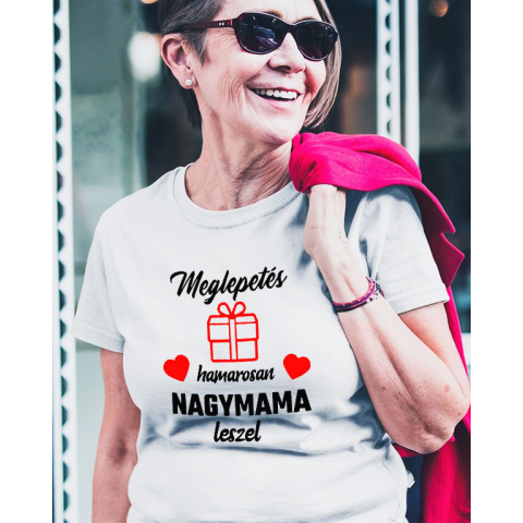 Női póló leendő nagyiknak, nagymama leszel. Meglepetés! Hamarosan nagymama leszel feliratos női póló. Nincs is nagyobb öröm, mint amikor egy anyukából nagyszülő lesz. Mondd el Édesanyádnak az örömhírt egy női pólóval, ami az első pólója, amit nagymamaként