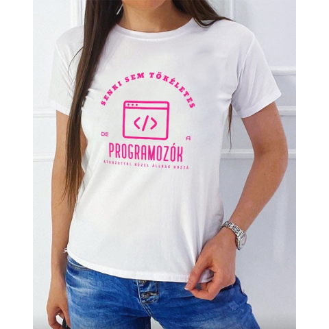 Programozós női póló, ajándék programozóknak. Senki sem tökéletes, de a programozók átkozottul közel állnak hozzá felirattal. Ajándékozz egy ilyen pólót párodnak, családtagodnak, munkatársadnak. Ideális meglepetés lehet névnapra, vagy akár születésnapra i