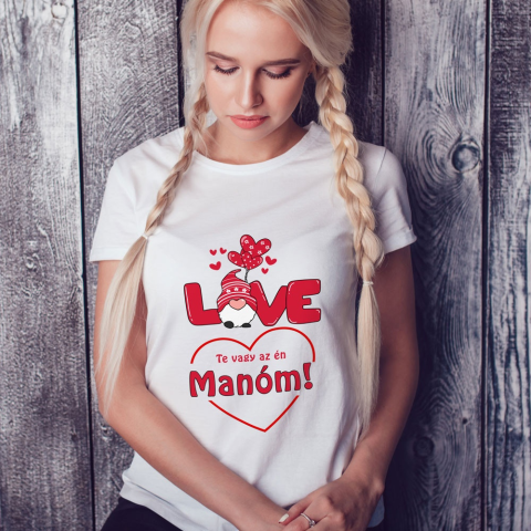 Szerelmes manós női póló, Valentin napi ajándék. Női póló szerelmeseknek, Te vagy az én manóm felirattal, cuki manó figurával. Karcsúsított szabású pamut póló, nőknek ajánljuk. Tökéletes ajándék Valentin napra, évfordulóra. Piros pólóra nem ajánljuk.