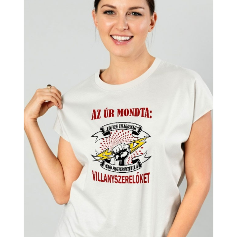 Női póló villanyszerelőnek, az úr mondta. Az Úr mondta legyen világosság, majd megteremtett a villanyszerelőket, szakmás női pólók egyedi, tartós mintával többféle színben és fazonban rendelhető 100% pamut póló. Kiváló minőségű férfi és női pólók, amel
