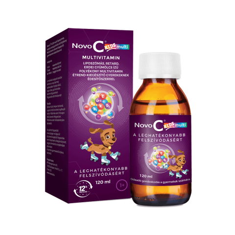 A Novo C® KIDS multi étrend-kiegészítő folyadék az összetevőket liposzómás formában tartalmazza. Komplex összetétele hozzájárul az immunrendszer és az idegrendszer normál működéséhez, formulájának köszönhetően pedig segíti a normál pszichológiai funkció, az egészséges izomfunkció, csontozat és fogazat fenntartását. A vitaminok összeállítása során tekintettel voltunk a gyermekeknél fennálló leggyakoribb hiányállapotokra, melyet a