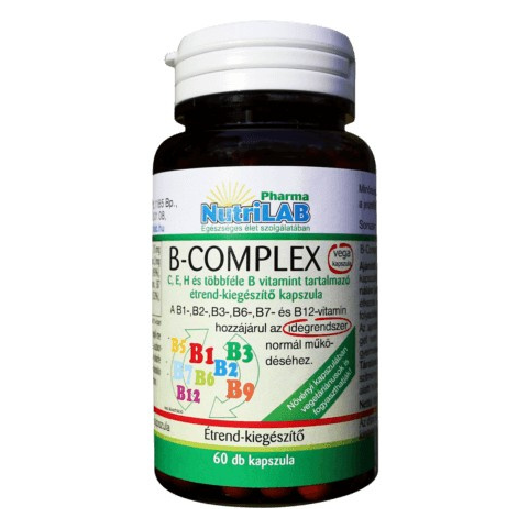 NutriLAB B-COMPLEX vega 60X C, E, H és többféle B-vitamint tartalmazó étrend-kiegészítő kapszula A B2, B3, B5, B6, B9 és B12- vitamin hozzájárul a fáradtság és a kifáradás csökkentéséhez. A B5-vitamin hozzájárul a normál mentális teljesítményhez. A