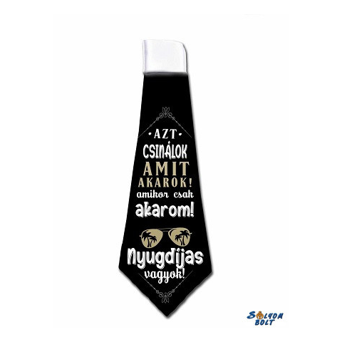Nyakkendő, Nyugdíjas vagyok. Azt csinálok, amit akarok, amikor csak akarom. Nyomott mintás, gumis, nyakba akasztható. Mérete: 37 cm x 13 cm Anyaga: poliészter