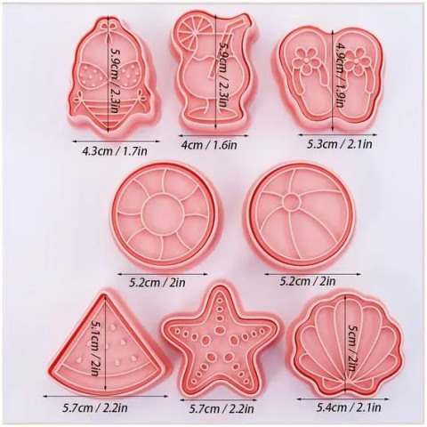8 féle nyári mintát tartalmazó, műanyag kekszpecsét készlet, kiszúróval együtt. A formák mérete átlagosan 5 cm