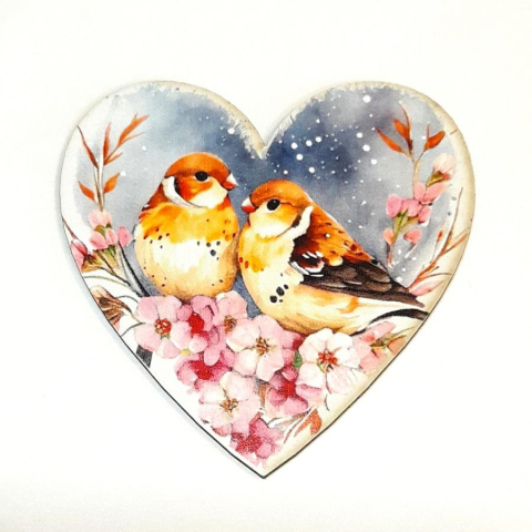 Kedves és vidám tavaszi dekoráció. Kiválóan alkalmas tavaszi díszekhez, de Valentin-napi, Anyák-napi ajándékok kísérőkártyájaként is tökéletes. A szív alakú dekorkarton tábla nyomtatott mintája két madárka egy virágzó ágon, így tökéletesen illeszkedik a tavaszi díszítésekhez.