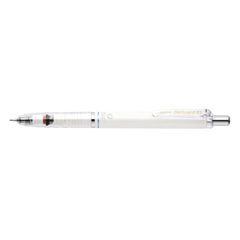 Nyomósirón ZEBRA DelGuard 0,5 mm fehér 0,5 mm-es mechanikus ceruza specialis kialakítása miatt nem törik a hegye fogórésze kényelmes beépített radírral fém klipsszel elegáns megjelenésű 0,5 mm standard grafit heggyel újtratölthető