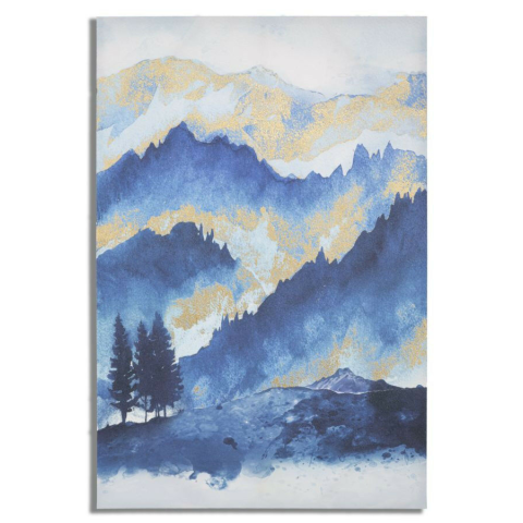 Hegyi táj festmény - Kék és arany impresszionista vászonkép - 80x3x120 cm Ez a lenyűgöző impresszionista stílusú vászonkép egy festői hegyi tájat ábrázol, kék árnyalatokban és elegáns arany díszítéssel. A képen látható hegyek és fák nyugodt és békés...