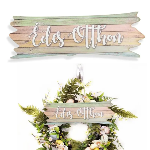 Varázsolj hívogató hangulatot a bejáratodhoz ezzel a bűbájos „Édes Otthon” dekorkarton táblával! A 7x20 cm-es méret ideális arányokat biztosít ahhoz, hogy egy nagyobb koszorú vagy egy fa falidísz központi eleme legyen. A lágy pasztell színek és a finom vi