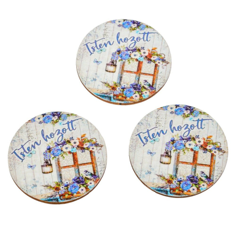 Nyomtatott fa tábla - Isten Hozott - kék, kör 5cm 3db-os