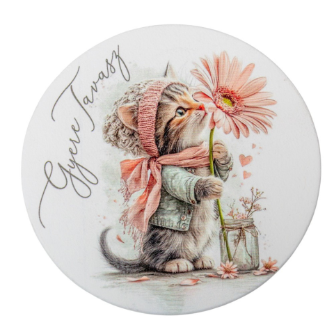 Nyomtatott fa tábla koszorú közép - Gyere tavasz cicás 11,8cm