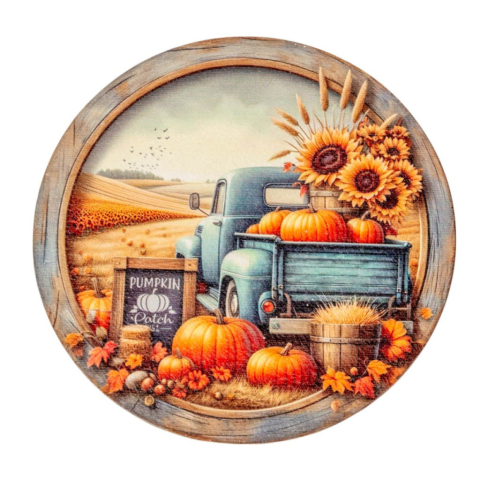Nyomtatott fa tábla koszorú közép - Őszi táj kék teherautóval 11,8cm Ismerd meg különböző egyedi mintájú és formájú nyomtatott tábláinkat és díszítsd velük alkotásaidat, hogy dekorációd újabb szintre léphessen és mindenki