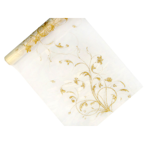 Nyomtatott Organza, krémszínű, egyoldalas arany brokát nyomattal, mérete 0,36x9 méter.
