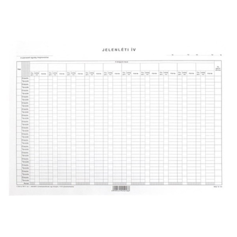 Nyomtatvány jelenléti ív A/3 havi Jelenléti ív, havi. A/3 méretű, fekvő, 2 oldalas, 10 fő. Kiszerelés: 100 db/csomag.