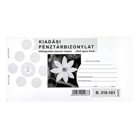 Nyomtatvány kiadási pénztárbizonylat költségvetési szervek részére fekvő 25x2 lapos Kiadási pénztárbizonylat költségvetési szervek részére. Fekvő, 25 lapos, 2 példányos. Minőségi belívvel, karton fedlappal rendelkező nyomtatvány. Tartós tűzött kötés