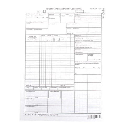 Nyomtatvány nemzetközi tehergépkocsi menetlevél Nemzetközi tehergépkocsi menetlevél. A/4 méretű, álló. Kiszerelés: 100 db/csomag.