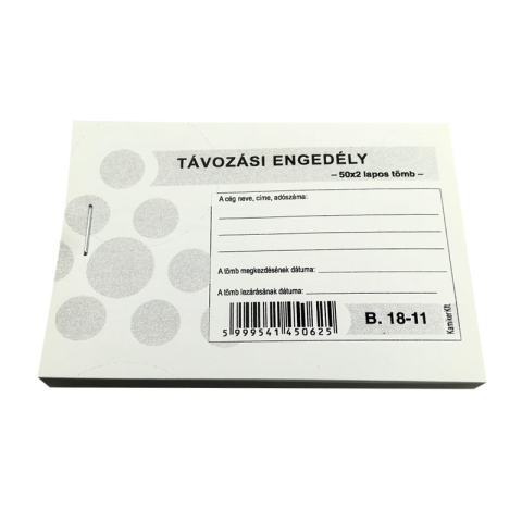 Nyomtatvány távozási engedély 50x2 Távozási engedély. A/6 méretű, fekvő, 50 lapos, 2 példányos.