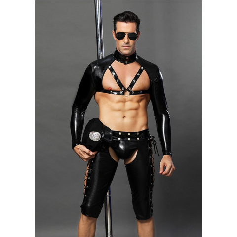 NYPD Rendőr szett.Vizes hatású rugalmas anyagból készült felső lakk pántokkal az elején és lakk gallérral.Vizes hatású rugalmas anyagból készült alsó,hátul kivágott.Lakk öv résszel.Rendőr napszemüveg.Rendőr sapka.