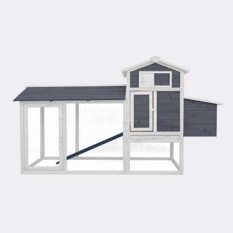Szabadon álló, praktikus két szintes tyúkól, zárt legeltetővel. A két emeletet lépcső köti össze. A felső szinten levő ketrecbe visszavonulhatnak a háziállatok. A tojásrakó fészek teteje nyitható, így könnyen hozzáférhet a tojásokhoz, és könnyen tisztítha