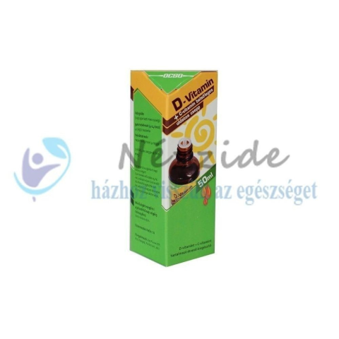 OCSO D-vitamin + C-vitamin belsőleges oldatos csepp étrend-kiegészítő 50 ml / üveg Aktív összetevők tömege: 50,5 mg/ml 50 ml nettó tömege: 50 g Összetevők: glicerin 85 százalék, aszkorbinsav, D-vitamin Hatóanyagok 0,2 ml (4 csepp) oldatban: C-vitamin