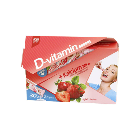 OCSO D-vitamin 4000NE + Kalcium 200 mg szájban oldódó granulátum étrend-kiegészítő 30 db tasak / doboz 30 db tasak nettó tömege: 75 g Összetevők: fruktóz, dextróz, kalcium (kalcium-citrát-tetrahidrát és kalcium-karbonát formájában), C-vitamin (aszkorbi