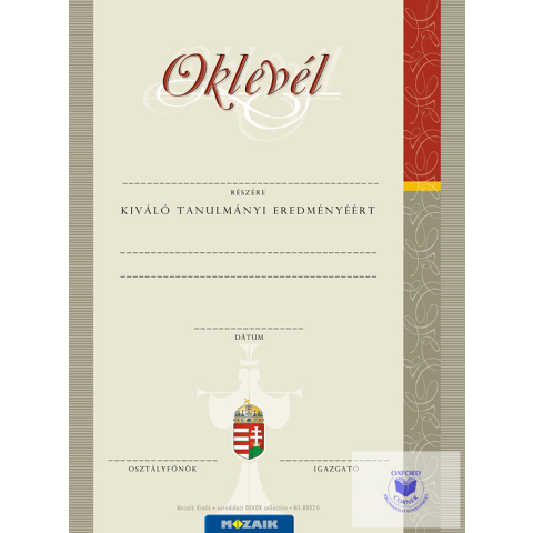 A csomag 20 db színes oklevelet tartalmaz B5-ös (17 x 24 cm-es) méretben, fényes papíron, vonalazással, elsősorban kézzel történő kitöltésre javasoljuk. Kiadói kód: MS-8802G Kiadó: Mozaik Kiadó