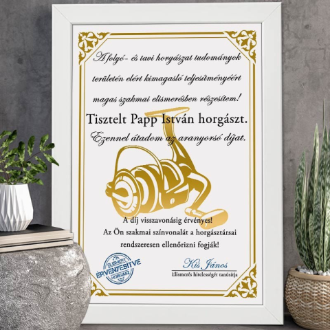 Aranyorsó Díj – Elegáns elismerés horgászoknak! Lepd meg a legkiválóbb horgászt egy exkluzív és humoros díjjal! Az Aranyorsó Díj egy stílusos, 30x40 cm-es fehér keretes oklevél, amely méltó dísze lehet bármely horgász otthonának. A letisztult fehér háttér