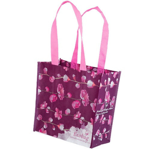 Ökotáska Virágos 100% Újrahasznosított környezetbarát PP ökotáska30 cm magasság × 30 cm szélesség × 18 cm mélységRózsaszín, vállra tehető erősített füllel10-12 kg teherbírás