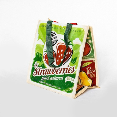1 100% Újrahasznosított környezetbarát PP ökotáska 32cm magasság × 30cm szélesség × 23cm mélység Piros és Zöld fül, vállra tehető hosszúságú, szőtt, erősített kivitelben 20-22 kg teherbírás több minta, a minta nem választahtó