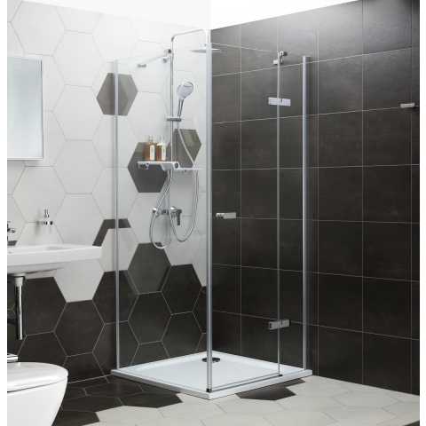 Oldalsó paraván a zuhanyajtóhoz mérete 197 cm. Összecsukható nyitórendszer. Bal és jobb oldali tájolás is. Profil fényes krómban , a felület átlátszó üvegből készült.