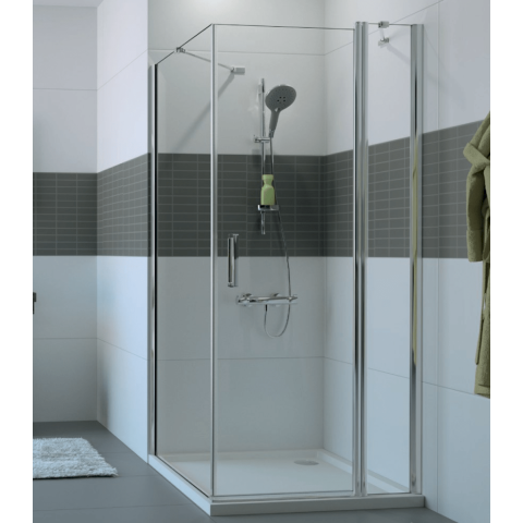 Oldalsó paraván a zuhanyajtóhoz mérete 200 cm. Összecsukható nyitórendszer. Bal és jobb oldali tájolás is. Profil fényes krómban , a felület átlátszó üvegből készült.