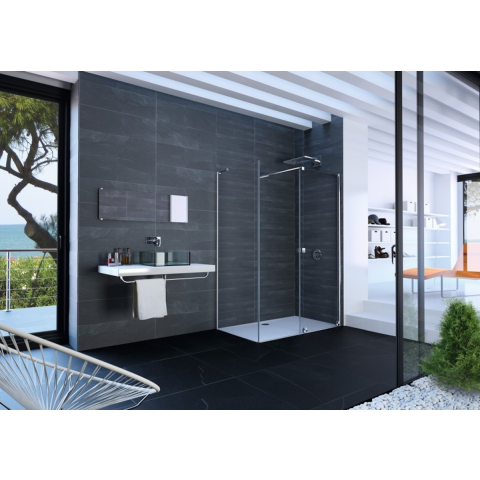 Oldalsó paraván a zuhanyajtóhoz tálca nélkül fényes krómban, a felület átlátszó üvegből készült dekor nélküli. A Hüppe Anti-Plaque technológiával - a gyártás során alkalmazott felületkezeléssel, amely megkönnyíti a tisztítást, és lehetővé teszi, hogy a víz apró cseppek formájában folyjon le. Összecsukható nyitórendszer. Bal és jobb oldali tájolás is.