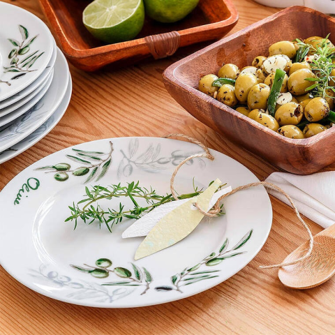 18 részes olíva mintás OLIVES tányérkészlet összetétele 6 db mélytányér 21,5 cm, 6 db lapostányér 24 cm és 6 db desszertes tányér 19 cm.