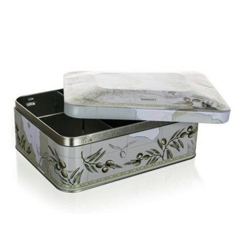 Fém tárolódoboz - OLIVES teásdoboz levehető fém tetővel, olíva motívumos díszítéssel, méret 200 x 155 x 80 mm.
