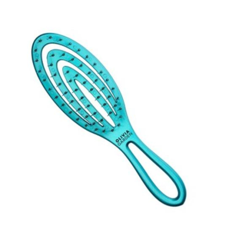 Kompakt hajkefe ideális utazáshoz is, kézitáskába vagy autóba. Hajlított forma, metál zöld szín. A haj és fejbőr számára gyengéd, kellemes az érintése