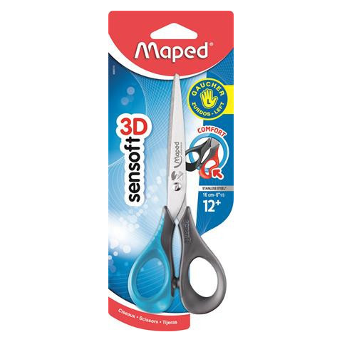 Olló, általános, 16 cm, balkezes, MAPED Sensoft 3D, vegyes színek Maped ollók a hosszú élettartamért! - optimális kényelem a balkezesek számára - egyszerű használat - 3D ergonomikus kialakítás, illeszkedik a kéz vonalára - fordított pengék - méret: 16