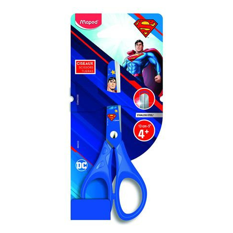 Olló, iskolai, 13 cm, MAPED Superman Legyél te is szuperhős a Maped Superman kollekciójával! -ergonomikus fogórész a kicsi kezek számára -rozsdamentes acélpengék, melyek kiváló vágási minőséget garantálnak -lekerekített végek a biztonságos használat é